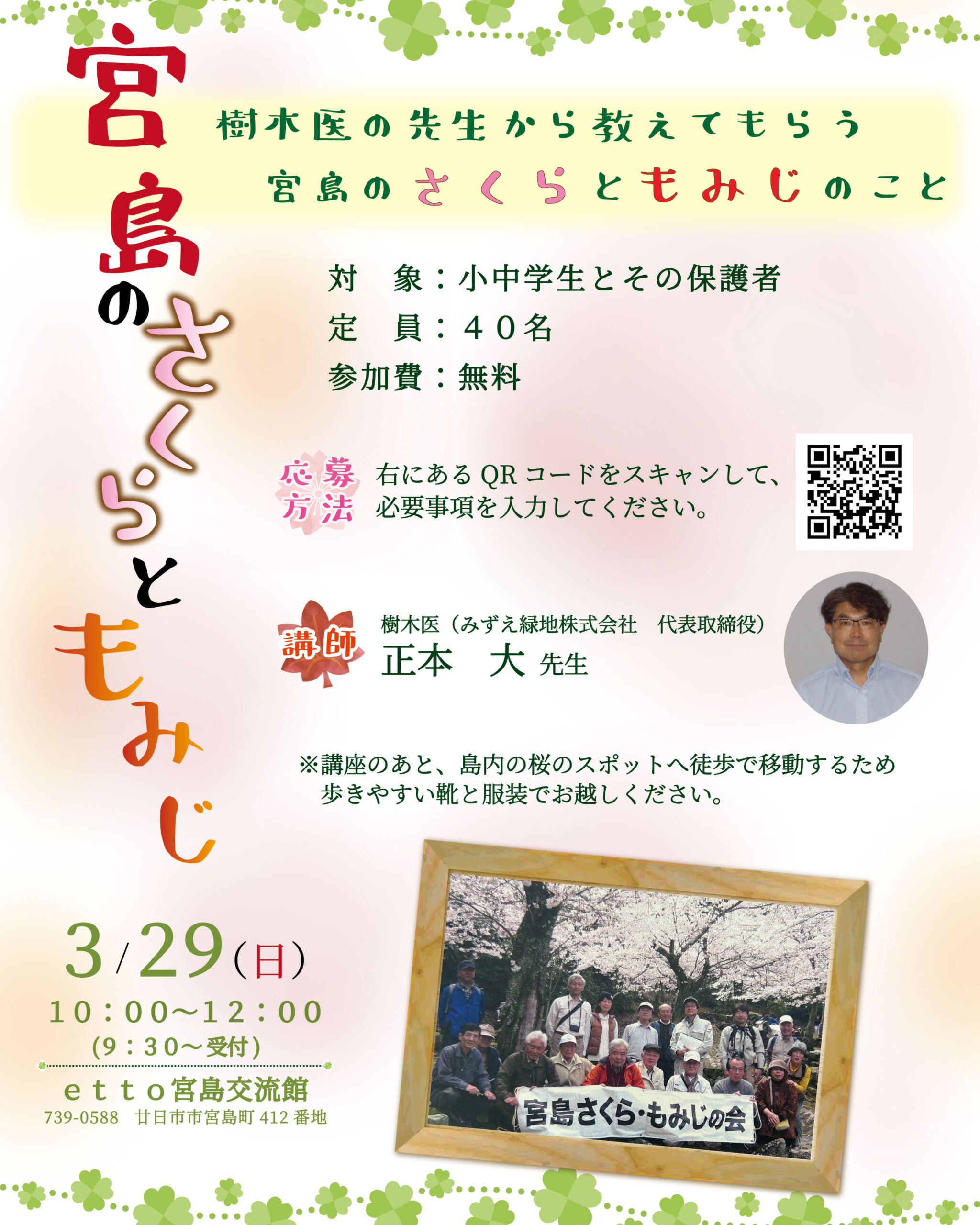 その一環として、樹木医の先生をお招きし、桜や紅葉をテーマにした学習イベント「宮島のさくらともみじの勉強会」を開催します。